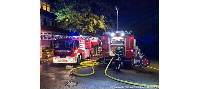 Am 05.10.2025 um 20.27 Uhr löste die Brandmeldeanlage der IGS in Waldfischbach-Burgalben einen Alarm bei der Rettungsleitstelle in Landau aus. Bereits beim Eintreffen der ersten Kräfte konnte, noch vor Überprüfung des FIZ der Brandmeldeanlage, ein Feuerschein im Bereich der Tordurchfahrt der ehemaligen Hauptschule festgestellt werden. Die sofortige Erkundung des Einsatzleiters ergab, dass in der Unterführung abgestellte Groß-Müllbehälter brennen und der Brand bereits auf die abgehängte Decke der Toreinfahrt übergegriffen hatte.